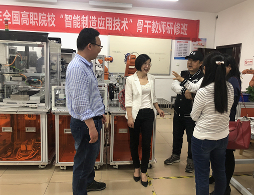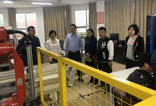 5月15日,湖南工程学院机电系主任谭季秋、实训中心教师陈壮等一行6人来我院交流学习,在院长何瑛、副院长曾小波、工程研究中心副主任肖慧慧等教师的陪同下,谭主任一行首先参观了工业机器人基础实训室、智能化改造与集成技术竞赛训练基地,随后双方就工业机器人技术专业的建设、实习实训的开展、机器人技术相关技能竞赛的经验进行了交流与讨论。