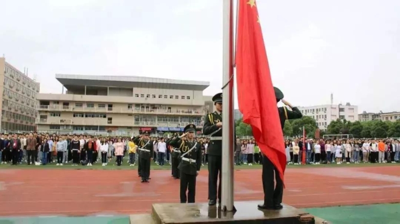 国旗班迈着矫健的步伐,护卫国旗走向升旗台。国旗在庄严的国歌中冉冉升起,全体师生肃立,向国旗注目行礼。