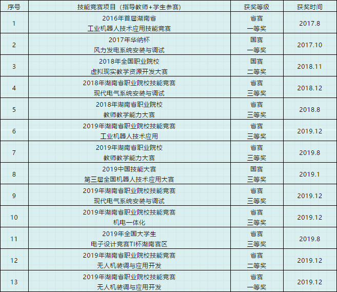 本专业师资力量雄厚,专兼职教师教授1名、博士1名,高级工程师2名,讲师3名,工程师1名,皆为双师型教师,兼职教师皆为高级工程师或硕士及以上学历。在专业领域有诸多研究成果,现场经验丰富,理实一体教学,教学效果显著,参加了德国双元制师资培训、国家级、省级教师能力提升培训。在工业机器人比赛、现代电气装调比赛、风力发电装调比赛、湖南省教师技能比武中屡获殊荣。团队教师本着对教书育人的初心,关心大学生成长成才,把满腔热忱投入到教育事业。