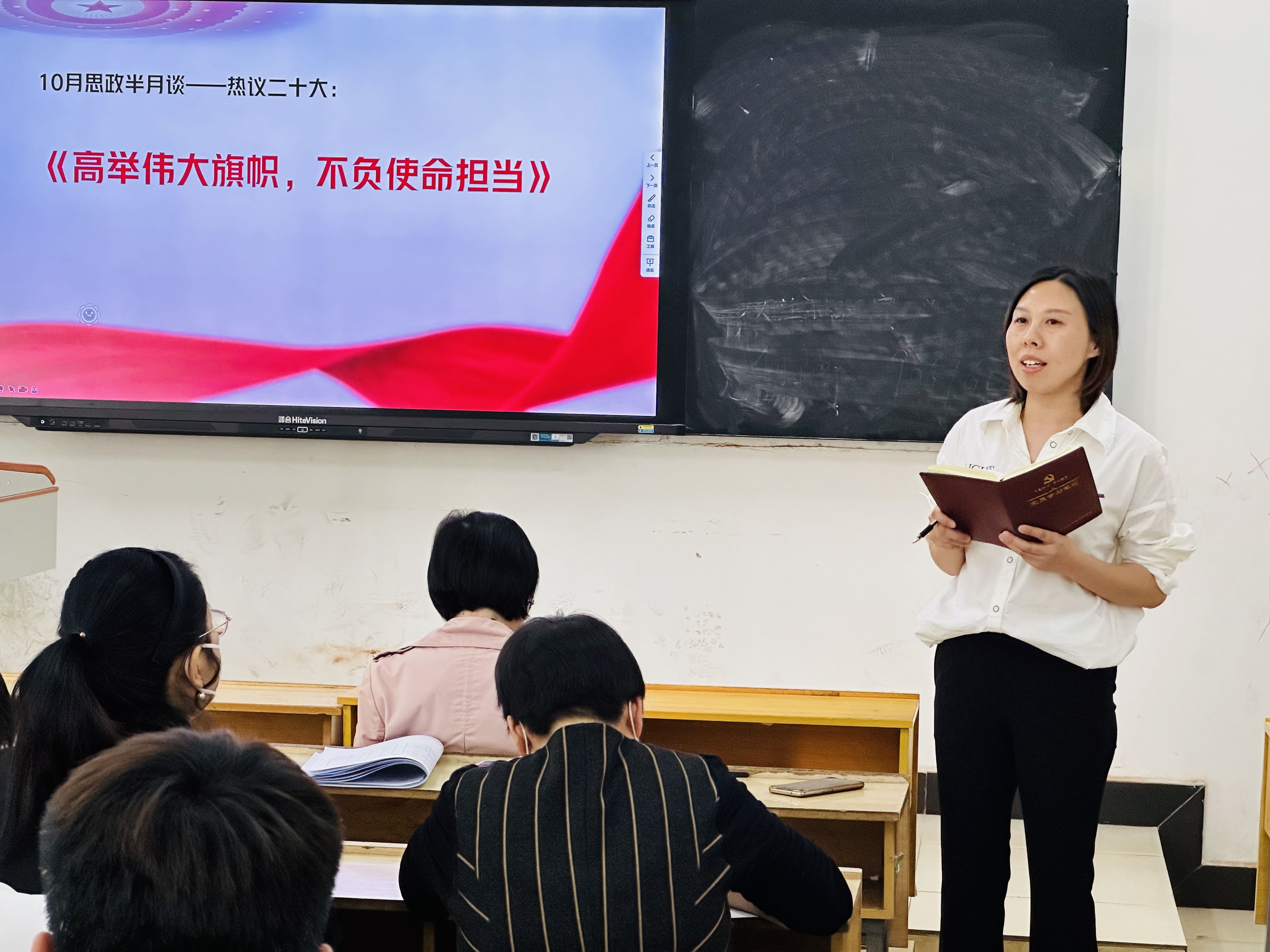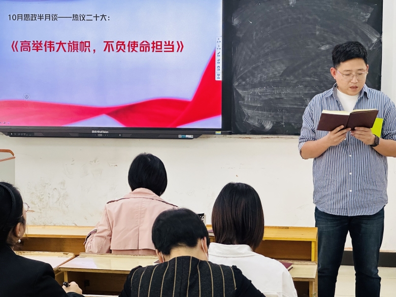 教工第三支部书记丁佳慧:从二十大报告中,我深刻领会要以习总书记坚持教育优先发展、科技自立自强、人才引领驱动,加快建设教育强国、科技强国、人才强国,坚持为党育人、为国育才,全面提高人才自主培养质量,着力造就拔尖创新人才,聚天下英才而用之。我们要办好人民满意的教育,全面贯彻党的教育方针,落实立德树人根本任务,培养德智体美劳全面发展的社会主义建设者和接班人,加快建设高质量教育体系。作为基层支部,我们应该执行党的路线、方针、政策,支持党委的各项决议的落实工作,统一基层党员的思想。紧密结合党委中心开展工作,保证本支部各项工作的顺利完成。充分调动本支部党员和教师的教学、科研、教改的积极性。
