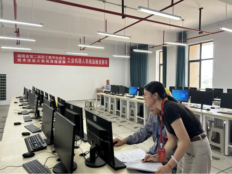 9月14日,湖南省第二届职工数字化应用技术技能大赛湘潭选拔赛(工业机器人系统运维员赛项、无人机装调检修工赛项、数据安全管理员赛项)三个赛项在湖南理工职业技术学院省级公共实训基地(湖南省“湖湘工匠”培训基地)举行,本次赛项任务主要由湖南理工职业技术学院智能制造学院承办,学校工会、教务处、学工保卫部、后勤处协办;湘潭市人力资源与社会保障局技能鉴定中心主任潘浩、副主任王华诚、湘潭市总工会调研员邹谦、湘潭市总工会劳动经济部部长赵正凯等来现场指导,主要负责选拔湘潭市最优秀的职工选手代表湘潭市参加湖南省第二届职工数字化应用技术技能大赛。