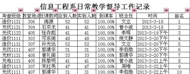 2013年3月28日上午10时,学工部部长宋乃冰、纪检考核处处长曾丹来我系,就企业文化进班级的进展情况、系部日常管理情况、学生日常出勤及到课率等方面工作进行检查指导,系党总支副书记张存彪接待并作工作汇报。主要就学生教育管理和学风建设中存在的问题和现象进行讨论分析,对于出勤率达到百分之百的班级进行表扬,并鼓励一直坚持下去。(信息系 戴科)