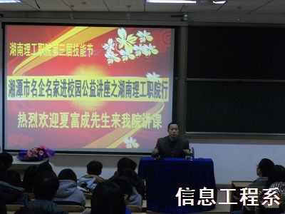 11月11日下午,我校在三教多媒体三迎来了湘潭市江麓房地产开发公司的总经理夏富成先生给我校信息工程系工程造价专业大二的同学讲座。信息工程系辅导员田野老师出席了讲座。