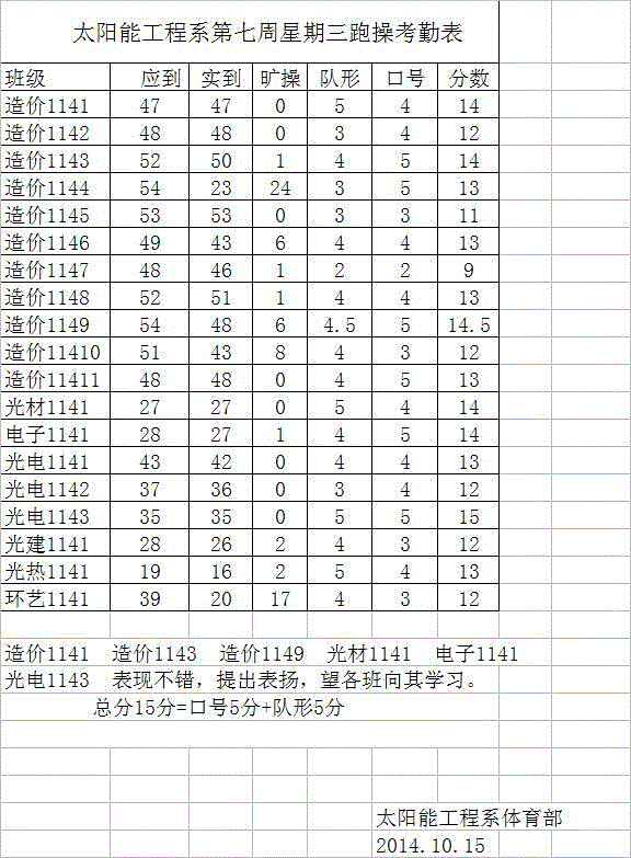 太阳能工程系第七周星期三跑操考勤表