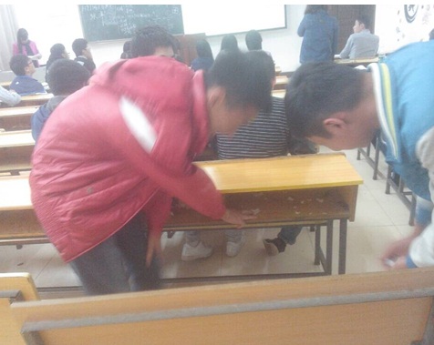 三教四楼:408教室-光建1141、光材1141班上课,课桌内有少许垃圾,已及时督促其将清理掉。