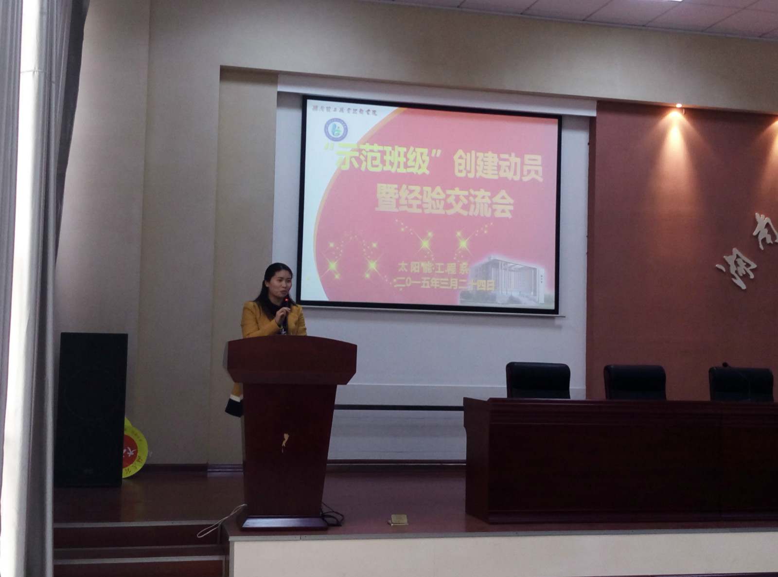 3月24日下午,太阳能工程系召开“示范班级”创建动员暨经验交流大会在图书馆报告厅举行,系党总支书记、主任黄建华、副书记田野,副主任向钠出席会议,此次大会嘉宾管理工程系雷霞老师,全体班主任、辅导员以及各班班委参加本次会议,会议由刘堃老师主持。