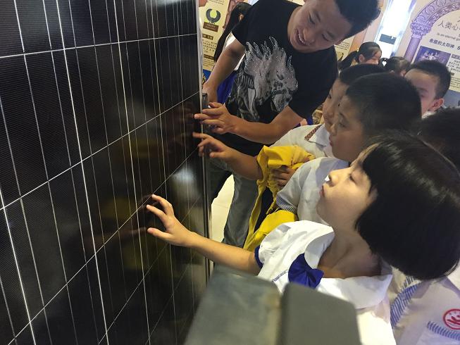 太阳能工程系向钠副主任带着师生来到“太阳神——人类心中永远的神”展示区,细心地讲述了太阳能的发展历史及作用,而孩子们一双双探寻科学的目光也被眼前神奇的太阳能展馆深深地吸引着。系部黄建华主任也详细地介绍了如何利用太阳能热发电、光伏发电等方法解决电力短缺问题,通过研究新的材料而告别白色污染等新能源的科普知识,最后还播放了一段精彩的能源演进历程视频。