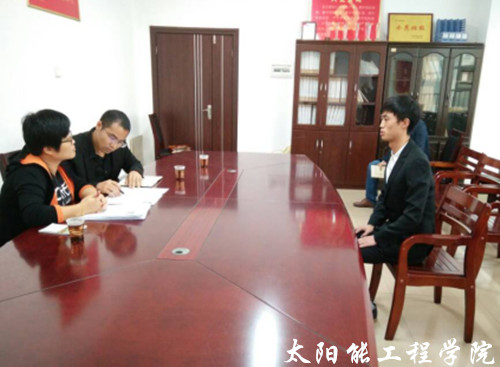 金秋十月、丹桂飘香,正是收获的季节。2016年10月13日下午2点,中国兴业太阳能技术控股有限公司面对太阳能工程学院光伏专业大三学子的招聘会在实训楼308顺利召开。面试由我院党总支副书记李强老师主持,由该企业人力资源部张闻斌经理、周超超经理进行面试。
