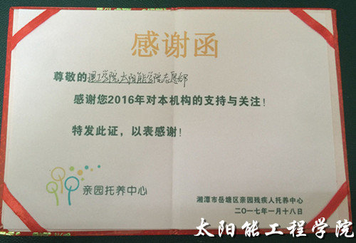 2017年2月21日,湖南湘潭市岳塘区亲园残疾人托养中心为感谢湖南理工职业技术学院太阳能工程学院志愿部对托养中心的支持与关注特地送来感谢函。