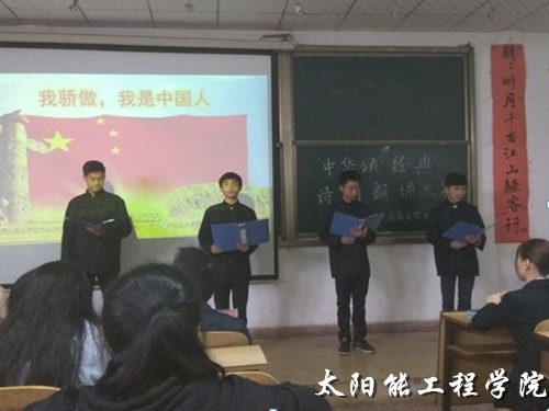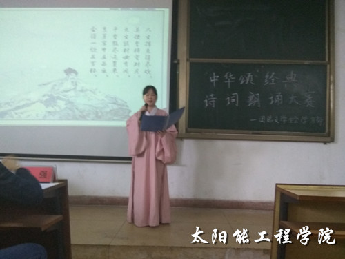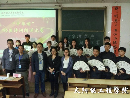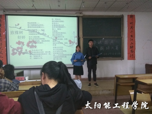 4月25日中午12:30,由太阳能工程学院团总支学生会学习部举办的“中华颂” 经典诗词朗诵比赛决赛按时拉开序幕。此次入选的选手共有12人分为8组,比赛由太阳能工程学院党总支副书记李强老师、团总支书记杨菲老师以及辅导员黄静老师,葛鸿雁老师,代增远老师担任评委。