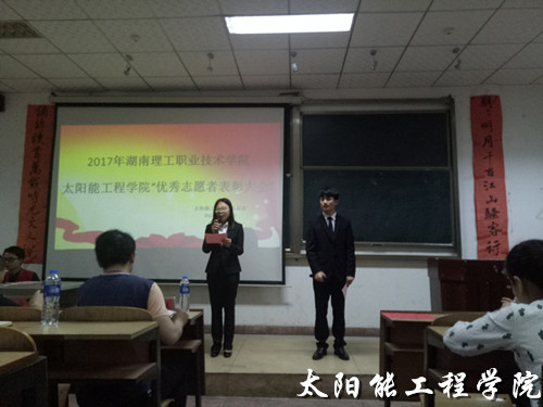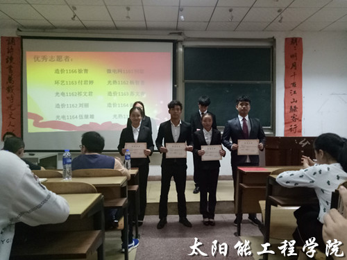 5月3日晚7:30,由太阳能工程学院志愿部举办的优秀志愿者表彰大会于三教410隆重展开。莅临本次大会的领导有太阳能工程学院党总支副书记李强老师及辅导员黄静老师、代增远老师、张洋老师。
