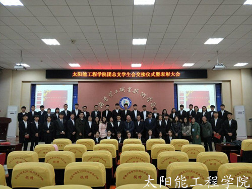 2017年11月21号晚,太阳能工程学院团支学生会交接仪式暨表彰大会在博学楼报告厅内隆重举行。参加大会的嘉宾有太阳能工程学院唐洪江老师、团总支书记代增远老师、学管干事刘堃老师,辅导员张焱茜老师、江源老师、余银萍老师以及管理工程学院主席团、风能工程学院主席团,和大学生记者团作为受邀嘉宾共同参加此次表彰大会。大会由太阳能工程学院团总支书记代增远老师主持。