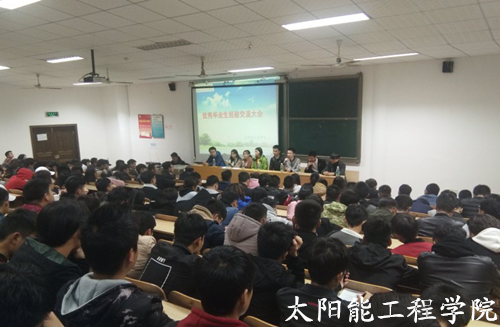 2017年 12月5日晚上,太阳能工程学院优秀毕业生经验交流大会在明理楼410室顺利举行,唐洪江老师,代增远老师,黄静老师、余银萍老师参加了这次交流会。此次交流会邀请了滕东、彭斌、胡晓华、宁倩、刘青、赵华阳、罗航宇、陈海八名2017届优秀毕业生代表,与在校的学弟学妹们交流学习、生活、工作经验。
