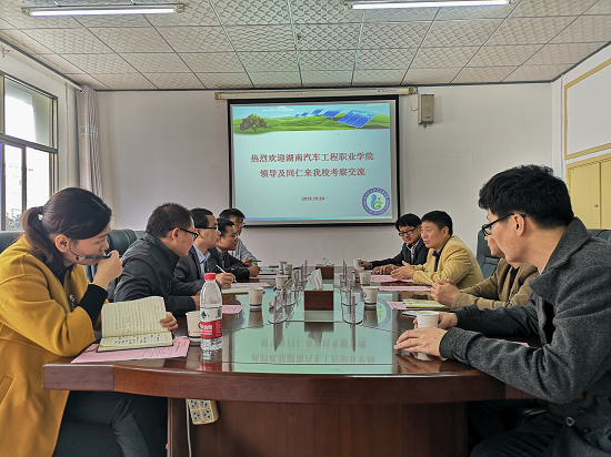 2018年10月24日上午,湖南汽车工程职业学院党委委员、车辆工程学院院长李治国,教师童大权、刘小兵、刘骞、刘嘉婷一行来我校考察交流,湖南理工职业技术学院党委委员、副校长黄霞春,新能源学院党总支书记、院长黄建华,教务处副处长张访问,光伏发电系统控制与优化湖南省工程实验室副主任张清小,光伏专业教师张要锋于求实楼会议室接待了各位来宾。