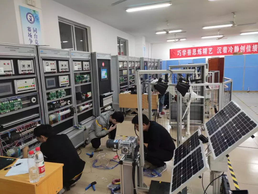 本次大赛特点是任务重、难度大、赛程长、要求严。比赛场次衔接紧凑,中午休息吃饭时间只有1个小时,对参赛选手和裁判老师的体力和心理都有很大的考验。竞赛内容涉及光伏电站搭建、风电场搭建、风光互补运营、监控和能源信息化管理系统的安装、接线、测试、编程、调试、故障排除等实训考核以及职业素养考核。比赛要求学生要在3个小时之内完成光伏、风力供电以及逆变装置的安装及接线,PLC程序调试、监控系统的组态建立及通讯连接,测试及分析数据等,对每组同学的个人专业技能和团队协作能力都提出了很高的要求。