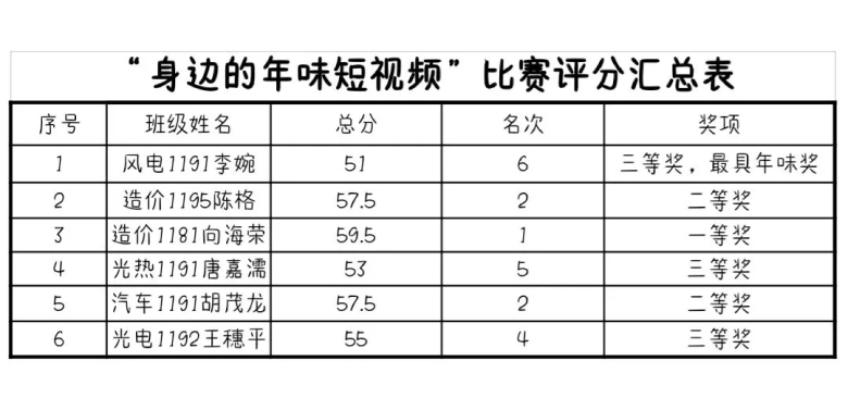 在“身边年味短视频”征集活动颁奖中,收到的百余条视频里,让大家感受到了参赛学生们家乡的民俗文化,增强了大家对中华传统文化的认同感和自豪感,经过层层筛选,反复审核,产生了一等奖一名、二等奖二名、三等奖三名、最具年味奖一名。