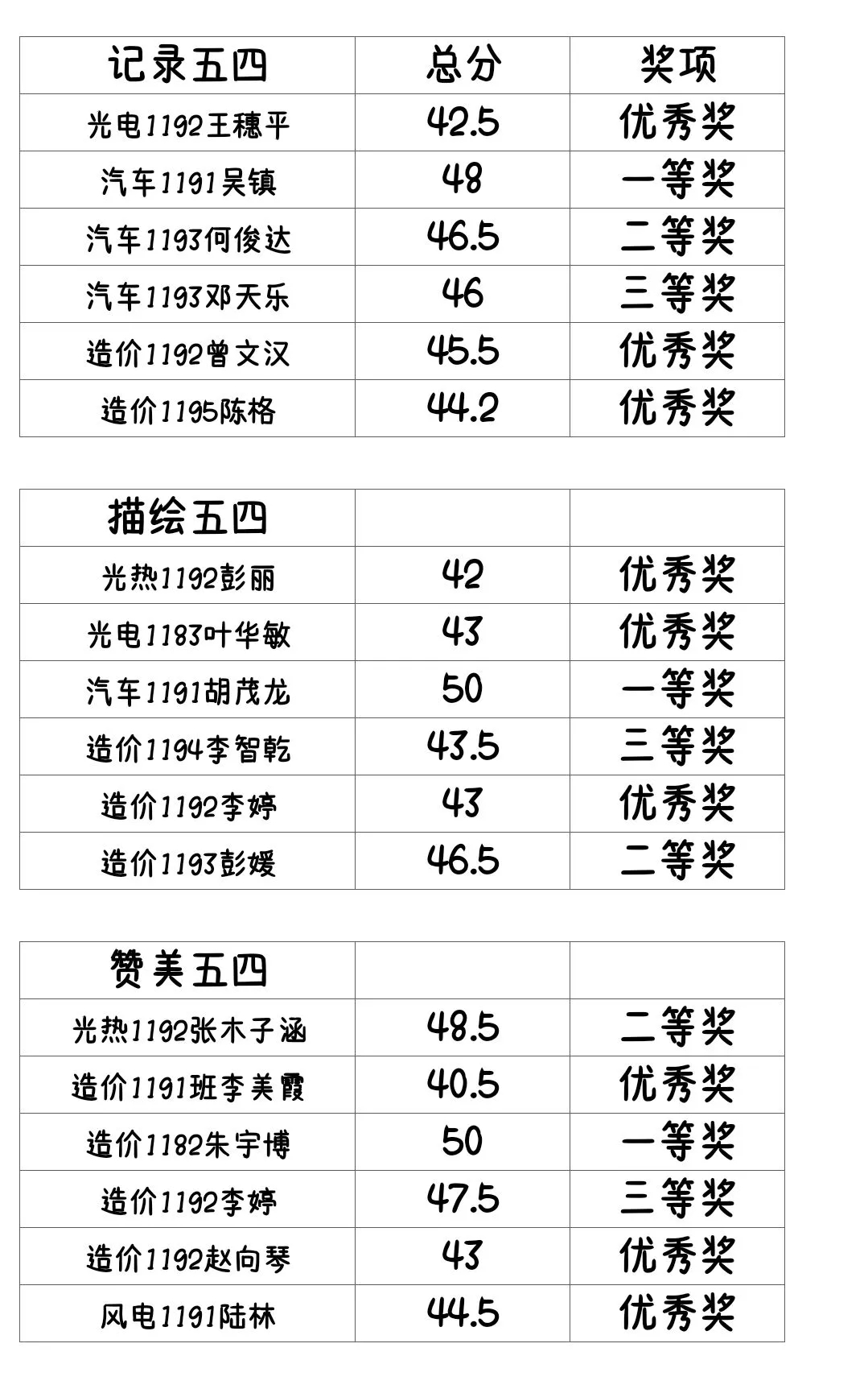 在颁发“五四精神,传承有我”比赛奖项中,让同学们充分认识到把个人理想与民族精神紧密联系在一起。在九十多份作品里产生了一等奖三名、二等奖三名、三等奖三名、优秀奖九名。