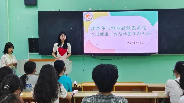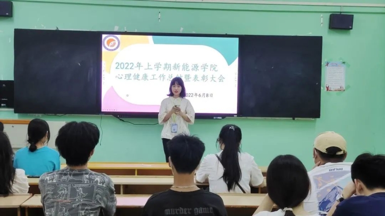 临近期末,为进一步加强新能源学院心理委员队伍建设,提升心理委员工作能力和积极性,切实加强和推进“育德”与“育心”相结合的心理工作教育,心理健康部于6月8月晚在明理楼408教室举办了新能源学院2022年上学期心理健康工作总结暨表彰大会,心理健康部全体干事,20、21级心理委员参加会议。大会由何媛媛主持。
