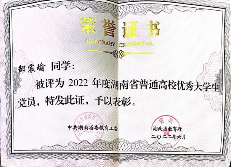 6月27日,中共湖南省委教育工作委员会、湖南省教育厅下发了《关于表彰2022年度湖南省普通高校优秀大学生党员的通报》,我院学生邹宸瑜被授予“2022年度湖南省普通高校优秀大学生党员”荣誉称号。