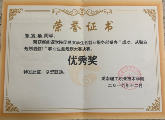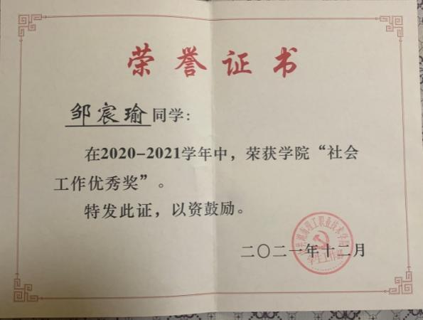 在工作上,邹宸瑜担任新能源汽车技术专业1193班班长、新能源学院辅导员学工助理、新能源学院执行主席等职务。他在工作上尽职尽责,尽心尽力解决同学们在生活中遇到的困难。带训第一天,为了让大一的学弟学妹们快速适应军训生活,无论是白天烈日当头的田径场,还是晚上温馨舒适的宿舍里,他始终陪伴在新生身边,应他们所急,解他们所需。在校期间,他也积极配合学院老师组织了一系列大学生活动:如团支部风采大赛、辩论赛、红色经典演讲比赛等等,取得了不少好成绩。