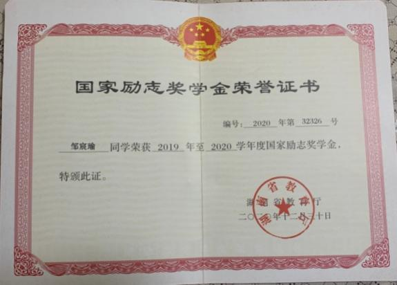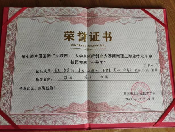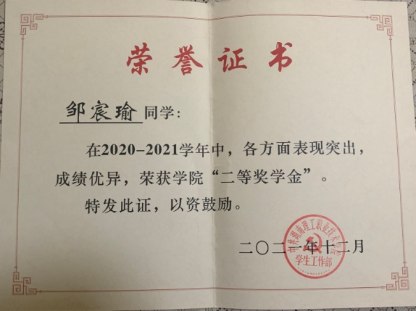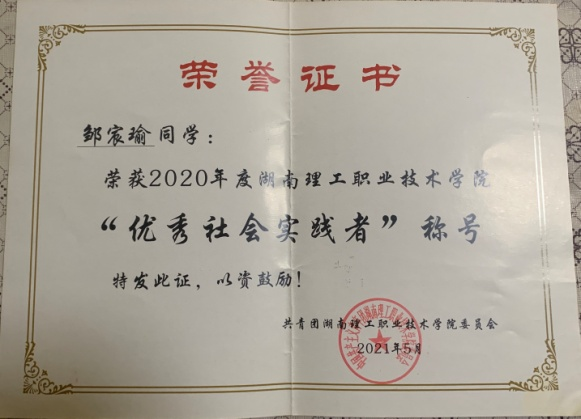 在2021年至2022荣获“国家励志奖学金”、“2022年度湖南省普通高校优秀大学生党员”、“校二等、三等奖学金”。并荣获以下荣誉:“三好学生”、“优秀学生干部”、“优秀团员”、“优秀社会实践者”、“优秀社会工作者”、“互联网+”创新创业荣获校赛一等奖、2021年8月“互联网+”创新创业荣获省赛三等奖、湘潭市退役军人创业创新“互联网+”市赛三等奖。