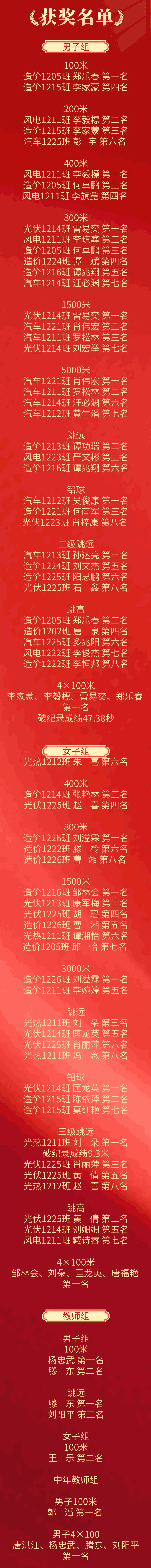 经过两天的激烈角逐,我院在本届校运会上又取得卓越的成绩:学生组蝉联第11届冠军,造价1215班李家蒙、光伏1214班雷易奕、风电1211班李毅標、造价1205班郑乐春在男子4×100米的项目中打破校运会历史记录,光热1211班刘朵在女子三级跳远项目中打破校运会历史记录。男子获奖34次,女子获奖27次,总计61次。教师组在此次运动会上总分排名第一,获奖6次。这是属于他们的荣耀,也是我们新能源学院,我们理工的骄傲。