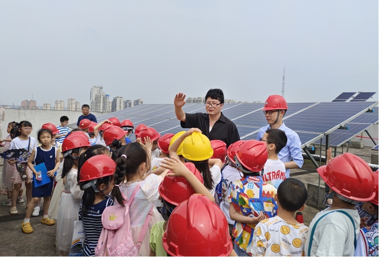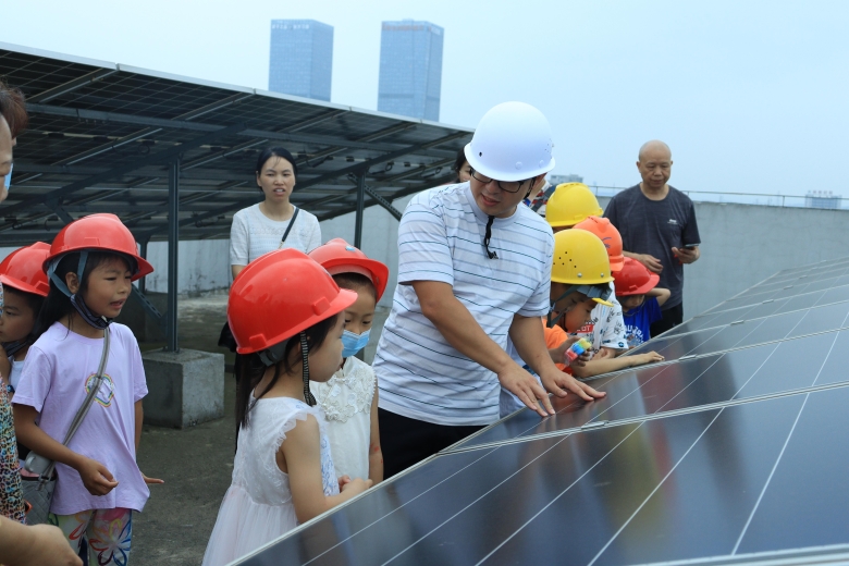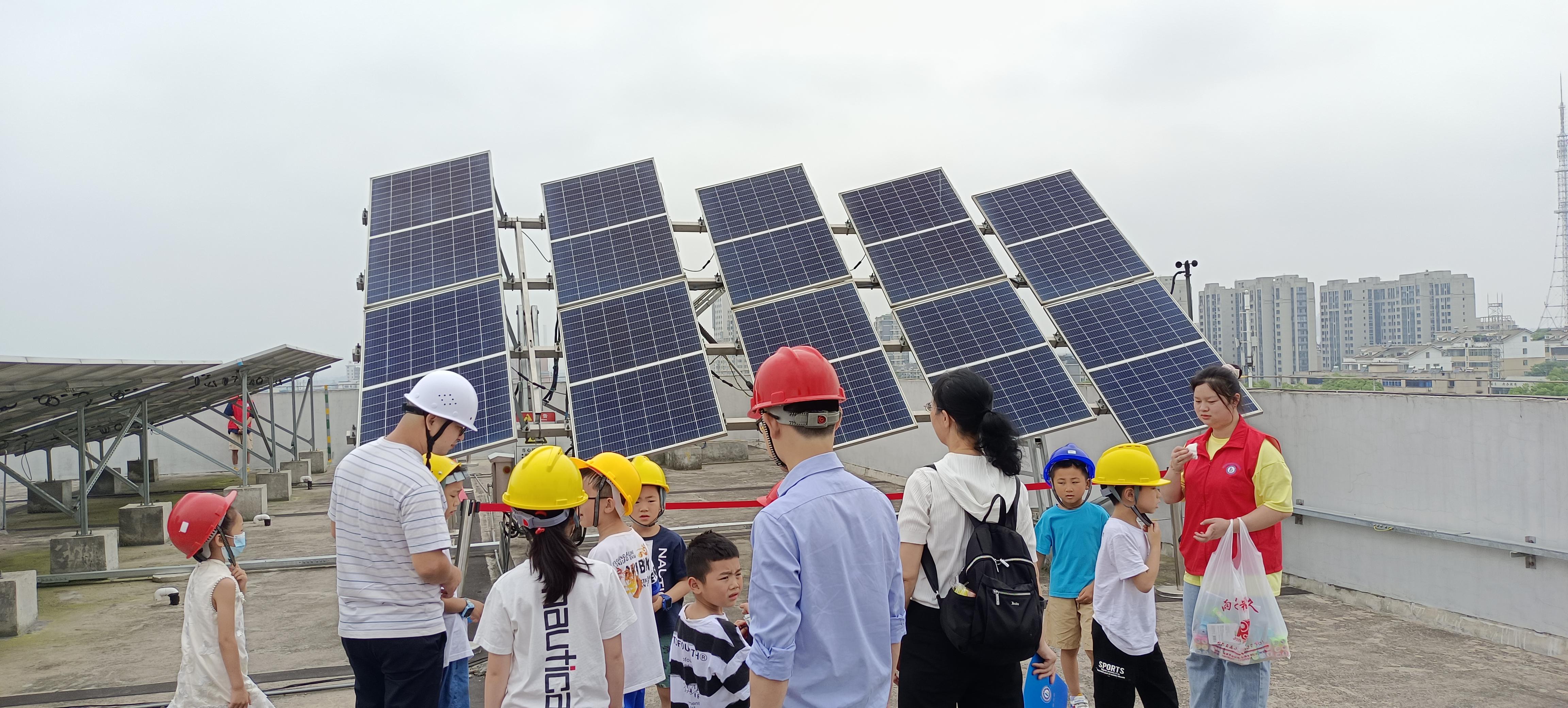 最后到公共实训基地北栋屋顶光伏电站,在志愿者为小朋友们分发、佩戴好安全帽后,有序进行参观活动。胡铮龙、钟坤炎两位老师精心准备了有奖答题环节,在小礼物的激励下,小朋友们踊跃答题,现场气氛十分热烈。小朋友们最感兴趣就是电站跟踪系统了,该系统类似向日葵一样会跟着太阳转动,老师们在经过详细解说后也表达了对小朋友们的祝愿,希望大家像向日葵一样“向阳而生,逐光而行”。