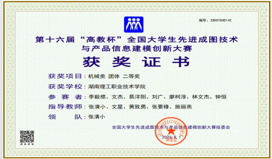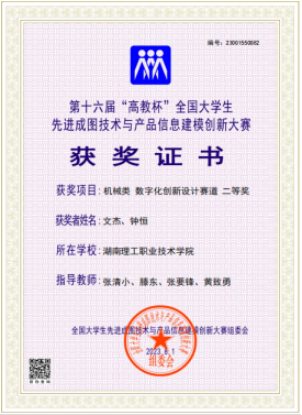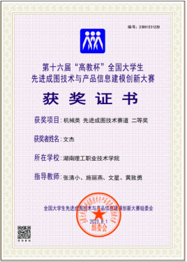 近日,第十六届“高教杯”全国大学生先进成图技术与产品信息建模创新大赛总决赛(机械类)在重庆交通大学举行。湖南理工职院新能源学院学子喜获佳绩,获得机械类团体二等奖、数字化创新设计赛道二等奖1项、增材制造赛道三等奖1项、先进成图技术赛道二等奖3项、三等奖5项,参赛学生个人获奖率100%。