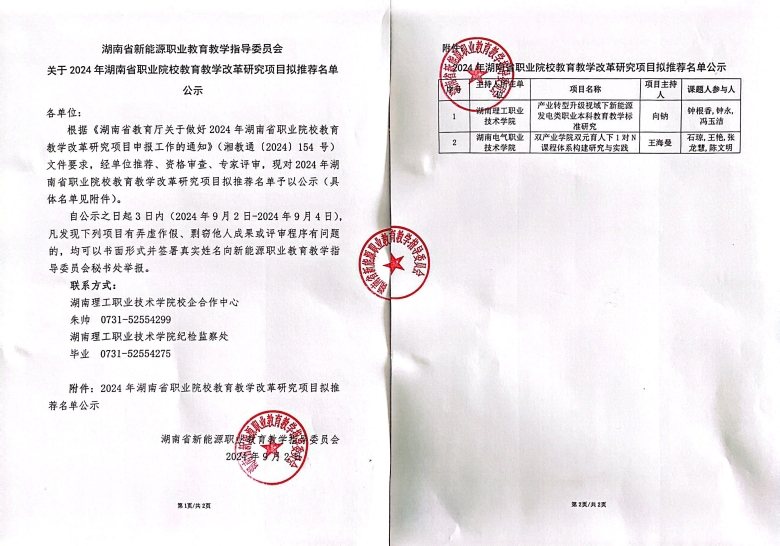 根据《湖南省教育厅关于做好2024年湖南省职业院校教育教学改革研究项目申报工作的通知》(湘教通〔2024〕154 号)文件要求,经单位推荐、资格审查、专家评审,现对2024年湖南省职业院校教育教学改革研究项目拟推荐名单予以公示(具体名单见附件)。