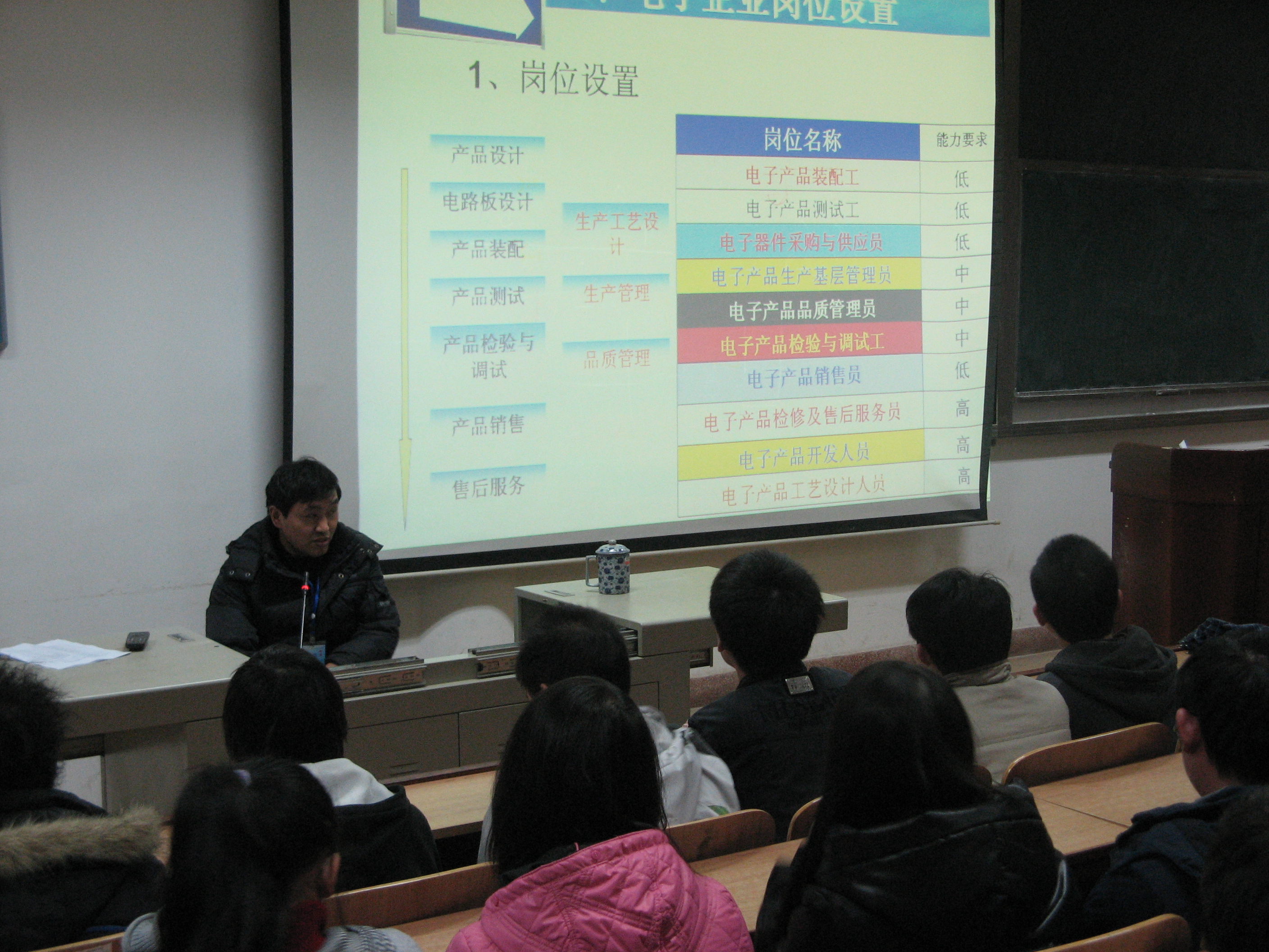 1月5日晚上,我系电子教研室在多媒体三举办了“专业方向”选择指导讲座,讲座由我系教学副主任田拥军副教授主讲,参加本次会议的人员主要是08级电子信息工程技术专业与电子工艺与管理专业的同学及其辅导员老师。