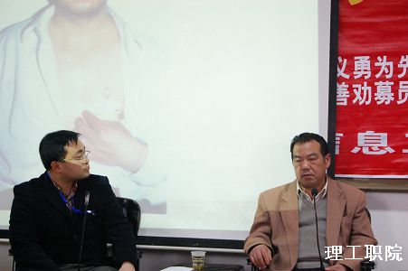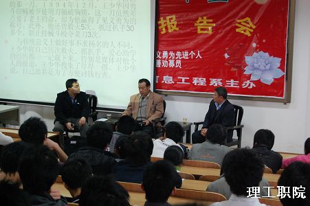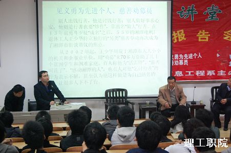 2009年3月27日下午2点30分,信息工程系在三教学楼第三多媒体教室举办了本学期第一次素质讲堂——爱心报告会。本次讲堂由系辅导员罗湘老师主持,湘潭市见义勇为先进个人、慈善劝募员王少华应邀担任嘉宾。王老用朴实的语言向同学们讲述了他特殊而感人的故事。 主持人在介绍王老的事迹 王老在讲述他的故事 王老在回答学生的提问 同学们在认真听讲