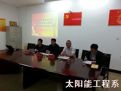 2014年4月2日晚上,太阳能工程系在党员活动室开展党的群众路线教育实践活动动员大会,学院院长罗先进、院督导组成员何放鸣、太阳能工程系党总支书记、主任黄建华,以及全体党员参加会议,会议由系党总支副书记田野主持。