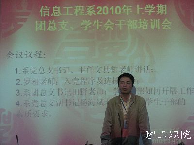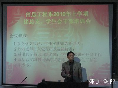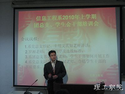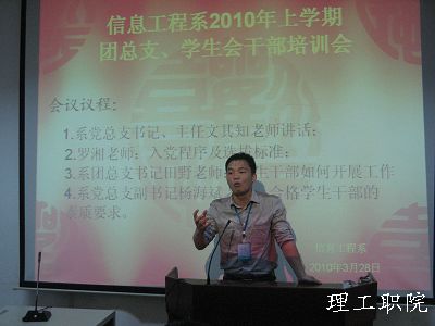 3月28日晚七点,新能源学院2010年上学期团总支、学生会干部首次培训大会在三教学楼多媒体三教室隆重召开。院党总支书记、院主任文其知老师,院党总支副书记、院副主任杨海斌老师,辅导员罗湘老师、田野老师、范海军老师、马云老师莅临了此次会议,会议由范海军老师主持。