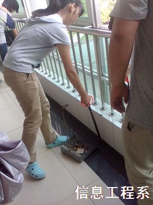 (图为学生整在三教三楼雨棚边缘清理烟头等垃圾)