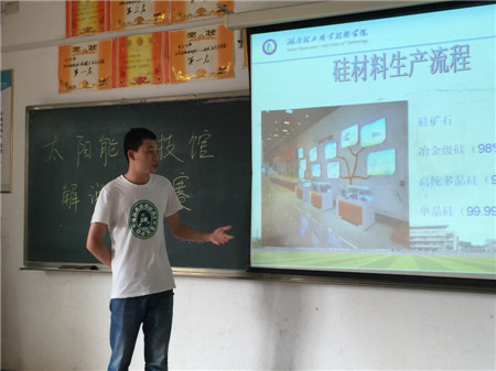 2015年5月19日下午5点,湖南理工职业技术学院太阳能科技馆解说员竞聘决赛在3教405教室举行,科研处处长田拥军、学工保卫处处长宋乃冰、院团委书记罗美霞、太阳能系党总支书记黄建华、太阳能系党总支副书记田野出席本次比赛并担任评委。