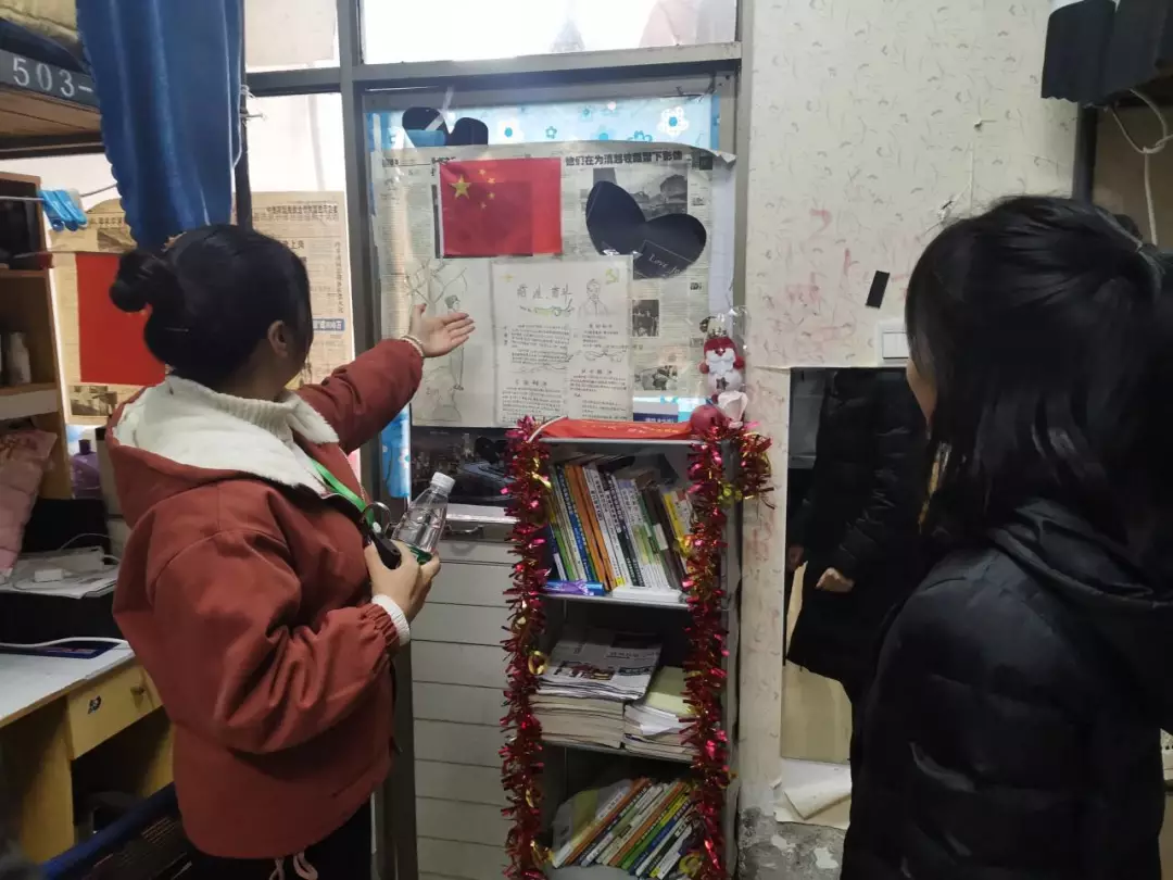 周冠兰、余银萍、何素清老师参观知行楼209寝室,在听完宿管部干事钟一帆的解说后,老师们首先对寝室温暖小灯等装饰提出表扬。此外,老师们也建议同学们在单调的地方再多添加一些元素,多多借鉴其他优秀寝室的经验,同学们纷纷表示会认真听取老师们的意见,对寝室再次进行设计修改。