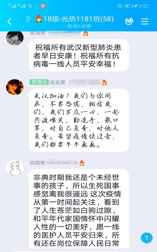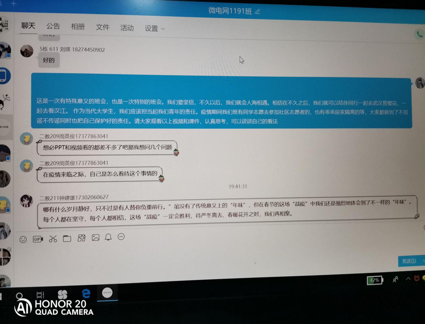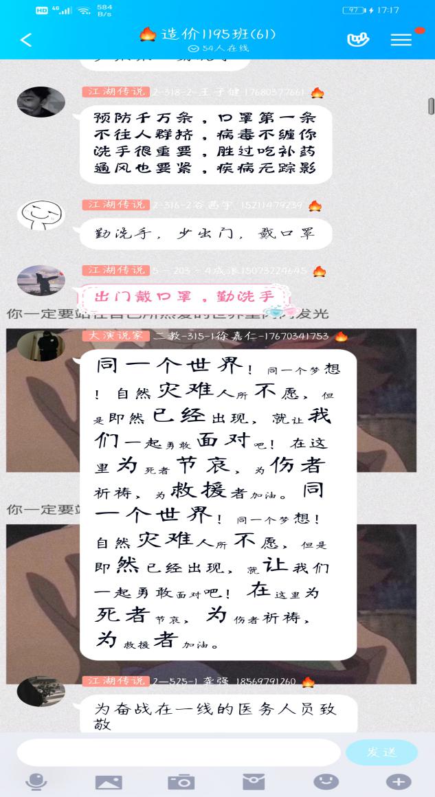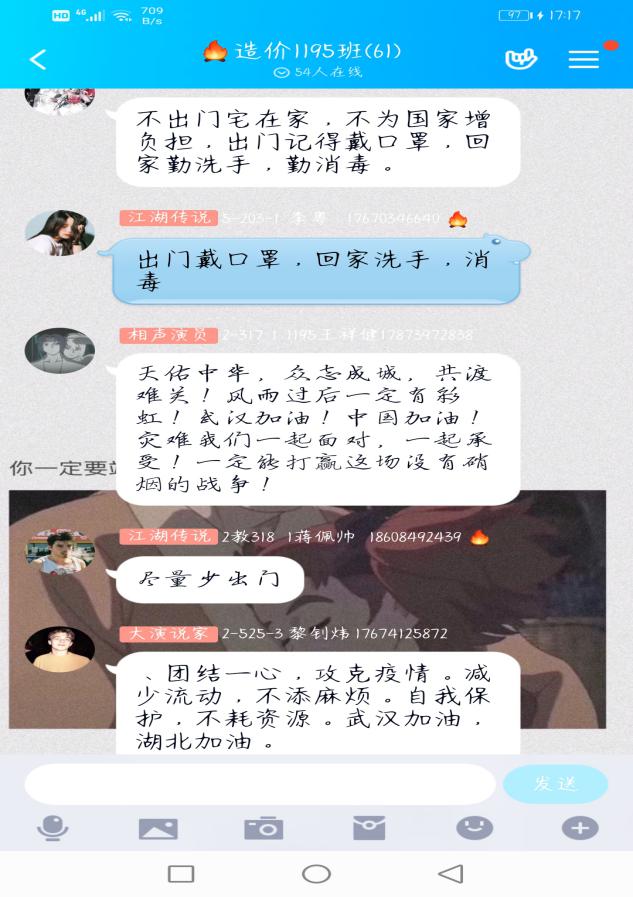 特殊期间的班会以特殊的形式开展,新能源学院的学子们也纷纷积极响应班级群中交流讨论。造价1195班在此次班会中,以文件和视频的方式同班上学生互动。视频中白衣天使、后勤人员以及所有与疫情对抗的人,都在日夜不休地在与病魔抗战,用他们伟岸的身躯为我们撑起一片蓝天。同学们看到视频都很感动,有同学感慨道:“正是因为有你们默默无闻的付出,才有了我们安全安稳的生活!身为学生,在后方一定不给你们添麻烦,努力学习,提升自己,默默给你们加油!我们一定会胜利,战胜这场无硝烟的斗争”。其他同学也跟着纷纷发言:“不出门宅在家,不为国家增加负担,勤洗手戴口罩”、“向一线人员致敬”、“为一线人员和国家打call”、“防控疫情从我做起”……