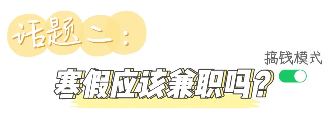 兼职是一个很好的锻炼自己的机会,有积累社会经验、积累个人财富、磨砺自己提升个人技巧等等的优点。但在采访中,受访者们所言的关于疫情影响和陪伴家人的种种原因也让源源犹疑了,屏幕前的你们觉得寒假到底要不要兼职呢?