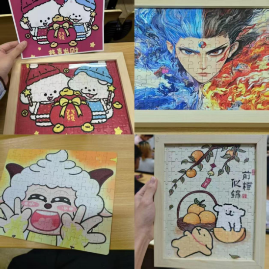 不同风格的拼图在大家的巧手下逐渐成型。那可爱喜庆的“恭喜发财”卡通拼图,洋溢着欢乐的气息;极具视觉冲击力的动漫人物拼图,更是将同学们对团结协助的理解与追求展现得淋漓尽致。每一块碎片的拼接,都凝聚着同学们的默契与耐心,也见证着他们在合作中不断成长。