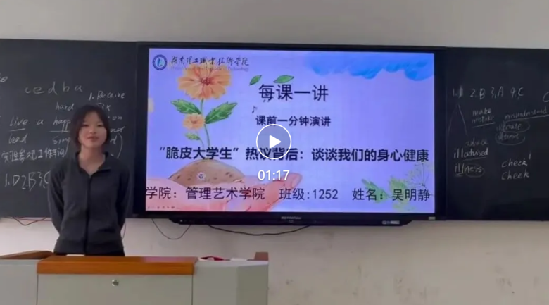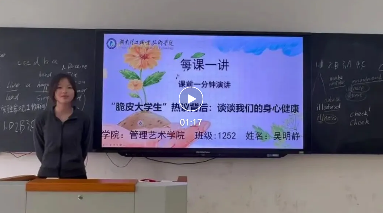 大家好我是设计2班的吴明静,今天我每日一讲的内容是关于“脆皮大学生”热议背后:谈谈我们的身心健康,“脆皮大学生”成为网络热词,不仅仅是调侃,更是身体发出的健康警报。熬夜玩作业、三餐靠外卖、久坐不运动,这些看似平常的习惯,正悄悄降低我们的健康“免疫力”,一点小意外就可能引发不适。作为大学生,一定要保证自己有强健的体魄。守护健康其实不难,我们只要做到好好吃饭,少点外卖,要注意营养均衡荤素搭配。运动也很重要,平时可以散散步,绕操场走两圈,睡前可以做做拉伸,都能缓解久坐疲劳。最后就是一定不要熬夜!熬夜是最伤身体的,游戏能明天玩,凌晨的手机屏幕再亮,也比不上规律作息带来的好状态。身心健康不是“选择题”,别等身体“报警”才重视,从今天的一顿热饭、一次散步开始,把健康握在自己手里。
