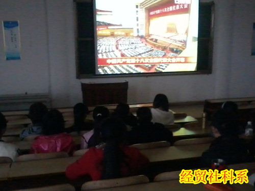 11月8日上午9时,举世瞩目的中国共产党第十八次代表大会开幕。经贸社科系党总支教工、学生党员在副书记曾庆安、副主任李文光的带领下,齐聚3教510教室,集中观看了十八大开幕式。