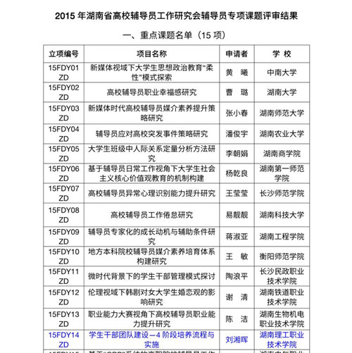 12月3日,管理工程系一项课题被湖南省高校辅导员工作研究会列为重点课题。