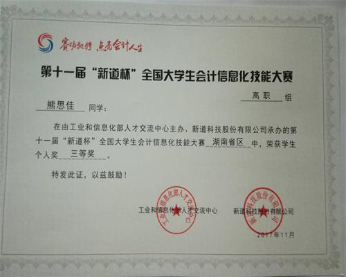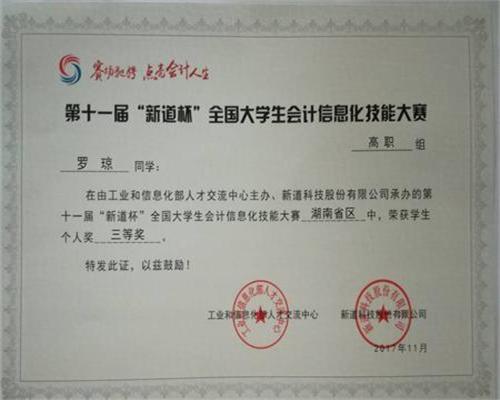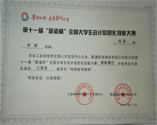11月18日上午9点,第十一届“新道杯”全国大学生会计信息化技能大赛,管理工程学院李艳老师指导的4位学生罗琼、熊思佳、谢樱、高洁获得省团体三等奖,罗琼、熊思佳分别获得省个人三等奖。