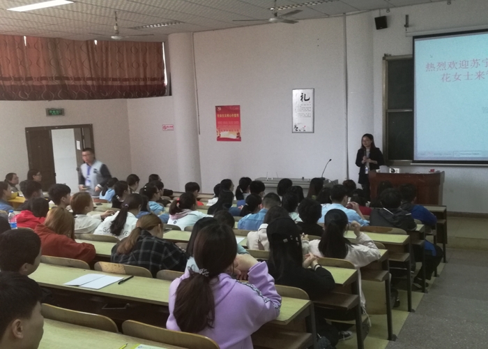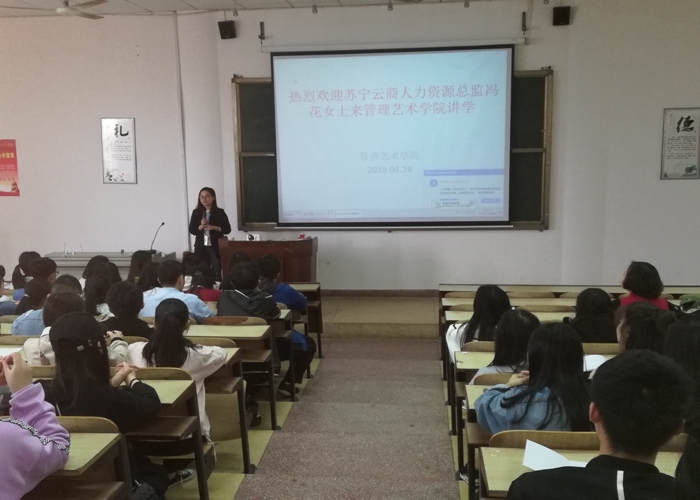 4月25日下午,湖南苏宁易购有限公司人力资源总监冯花女士到管理艺术学院给工商管理专业学生做了一堂精彩的讲座,受到管理艺术学院老师以及学生的热烈欢迎与一致好评。在做讲座之前,副院长夏红雨老师、工商专业负责人周星岚老师与冯总就我校提出的“1+1+1”的教学模式以及双方校企合作的事宜进行了深度交流,并表示尽快完成双方互相挂牌、签订校企合作协议的相关事项。