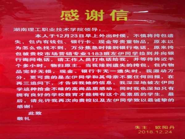 多年来,我校始终坚持“立德树人,德育为先”的办学方针,2018年学校出台了《湖南理工职业技术学院思想政治工作质量提升工程实施方案》,为全面提高人才培养质量作出总体规划设计。左伊拾金不昧的行为充分体现了我校学生高尚的道德情操,在此,对左伊同学给予通报表扬,希望我校学子以左伊同学为榜样,注重品德修养,继续发扬拾金不昧的精神,以实际行动践行社会主义核心价值观。