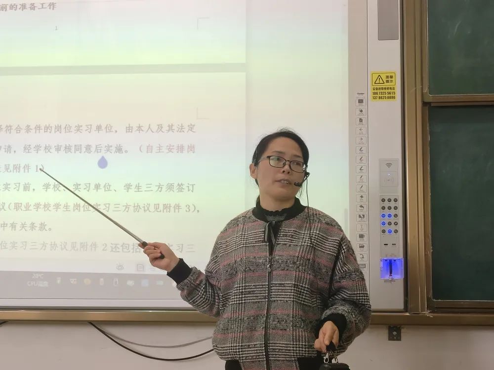 谭富对顶岗实习工作进行了全面的讲解和答疑。她强调了顶岗实习工作的重要性,鼓励同学们多投简历并及时签订好第三方协议和知情同意书,做到无协议不实习。同时,也着重的提醒学生们,在实习期间要按时填写实习日报、实习周报、实习总结。在此之前,要按照学院要求做好毕业设计答辩等相关工作方能离校实习。