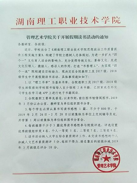5.读书活动纳入大学生综合素质测评工作,未交读书感想的个人扣减人文艺术素质测评 5分,组织不得力、排名靠后的班级扣减2019年 3 月班级总评分 10 分。