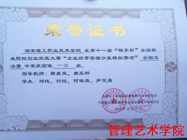 12月16日,管路艺术学院代表队在第十一届“畅享杯”全国职业院校创业技能大赛“企业经营管理沙盘模拟赛项”中荣获全国总决赛团体一等奖。