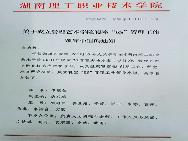 关于成立管理艺术学院寝室“6S”管理工作领导小组的通知