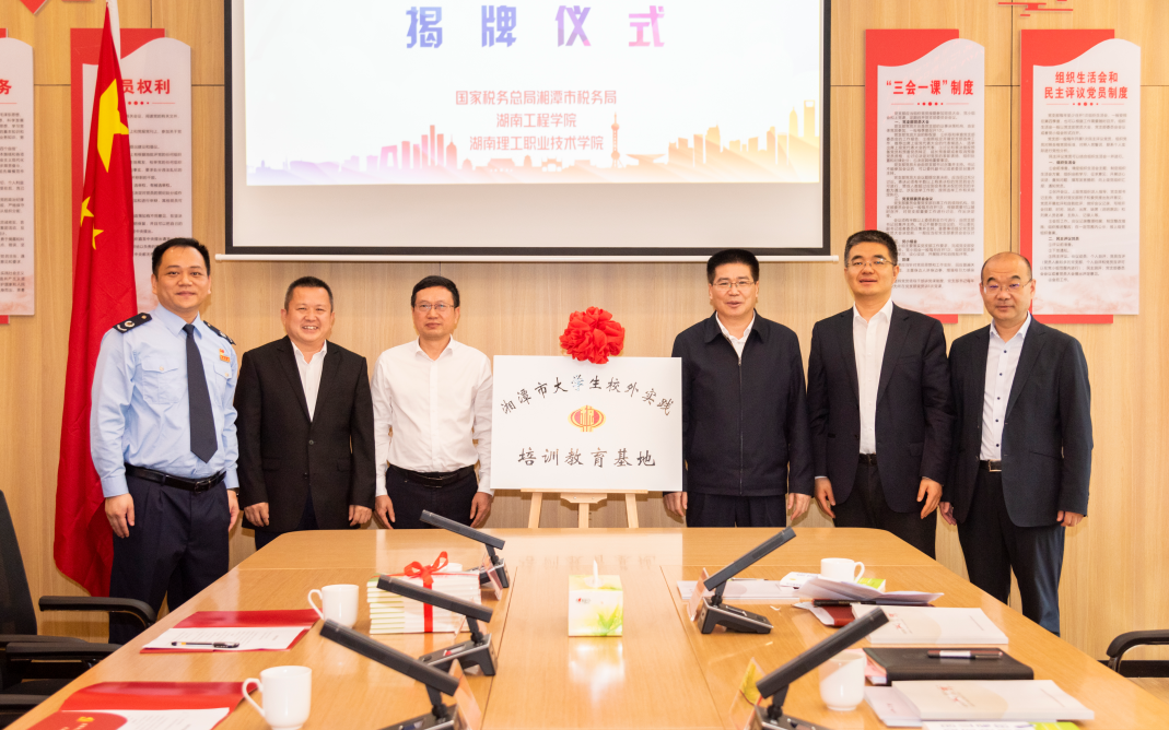4月23日,湖南首个“大学生校外税务实践培训教育基地”在湘潭市“市民之家”办税服务厅亮相。国家税务总局湖南省税务局党委书记、局长曾光辉,国家税务总局税收宣传中心副主任任鹏飞,湘潭市委常委,市人民政府常务副市长刘新华共同见证“湘潭市大学生校外税务实践培训教育基地”揭牌。